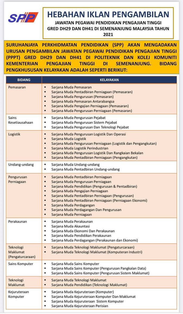 Saya merupakan PPP Gred DG29 DG32 DG34 dan DG38 di bawah KPM yang memiliki kelayakan Ijazah Sarjana Muda. Maklumat Lanjut Sila klik untuk maklumat lanjut Tarikh Kemaskini. Suruhanjaya Perkhidmatan Pendidikan SPP mempelawa individu di dalam negara untuk memohon jawatan tetap sebagai Pegawai Perkhidmatan Pendidikan Gred DG41.