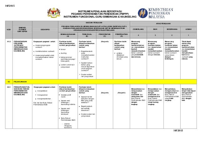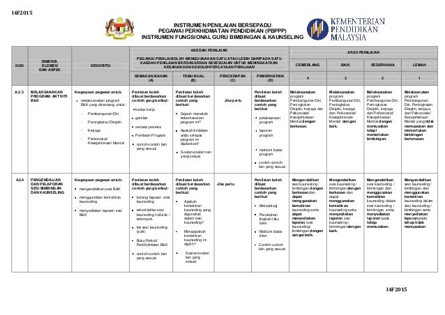 5 4 3 2 1. Click to expand document information. Instrumen penilaian bersepadu pegawai perkhidmatan pendidikan pbppp instrumen fungsional guru bimbingan kaunseling i4f2015 kod dimensi elemen dan aspek deskripsi kaedah penilaian pegawai penilai boleh menggunakan satu atau lebih daripada satu kaedah penilaian berdasarkan kesesuaian untuk meningkatkan.