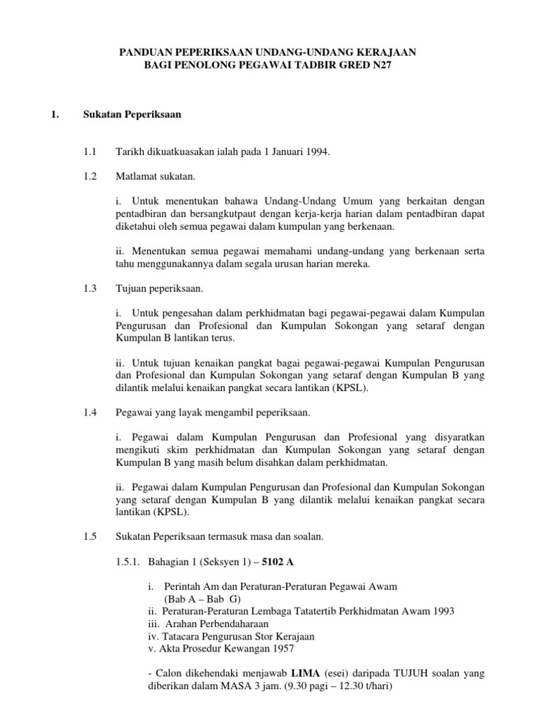 Tarikh Sukatan Peperiksaan Dikuatkuasakan Oleh Jabatan Perkhidmatan Awam. Pengesahan Pelantikan dilaksanakan berdasarkan Perkara 1441 Perlembagaan dan Peraturan-peraturan 20 21 22 dan 23 Peraturan-peraturan Pegawai Awam Pelantikan Kenaikan Pangkat Dan Penamatan Perkhidmatan 2012 PU. Bagi membolehkan pegawai-pegawai dalam Gred 19 hingga Gred 28 mempunyai pengetahuan asas mengenai arahan dan peraturan Kerajaan.